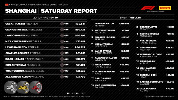 Subota na Velikoj nagradi Kine bila je vrlo interesantna. Prvo je vožena sprint utrka u kojoj je Lewis Hamilton došao do pobjede u bolidu Ferrarija, a nekoliko sati kasnije održane su i kvalifikacije, u kojima su se vozači borili za što bolje startne pozicije u nedjeljnoj Grand Prix utrci. Tom je prilikom najbrži na stazi bio Oscar Piastri u McLarenu, a u prvom startnom redu pridružio mu se Mercedesov vozač George Russell.